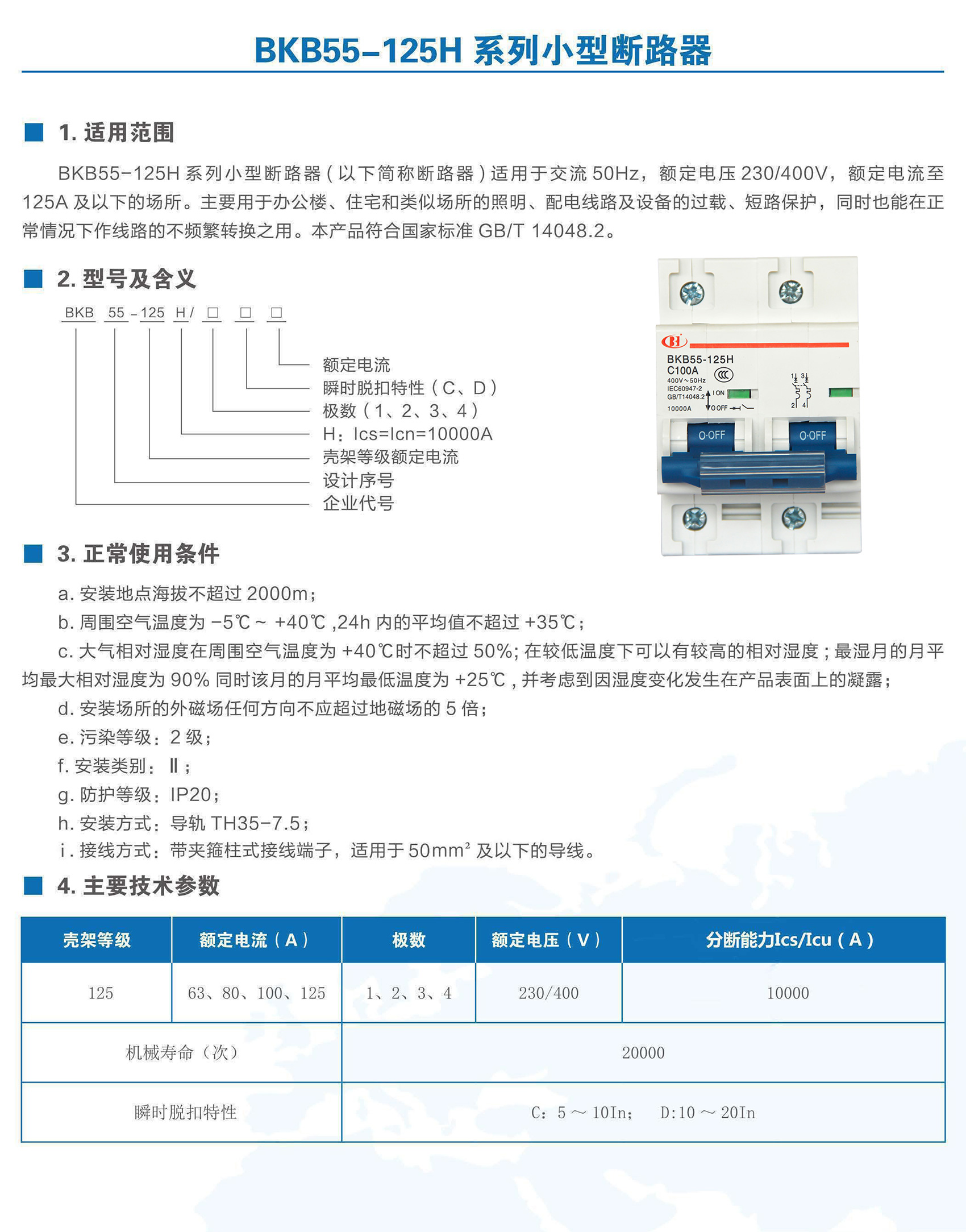 BKB55-125H系列小型断路器适用于交流50Hz,额定电压至400V,额定电流63~125A的系统线路中。用来对建筑电厂、变电站、电信、交通、冶金、工矿业等及类似场所的系统线路、电气设备进行过电流保护,也可以用于不频繁的通断操作。适用于非专业人员使用且不需要进行维护。本产品符合GB/T 14048.2、IEC 60947-2标准。