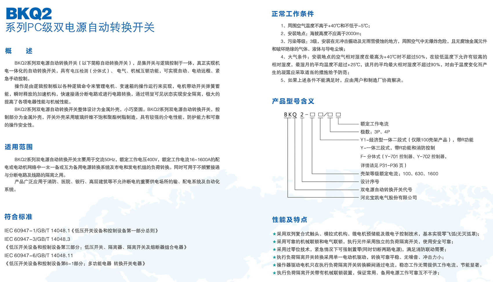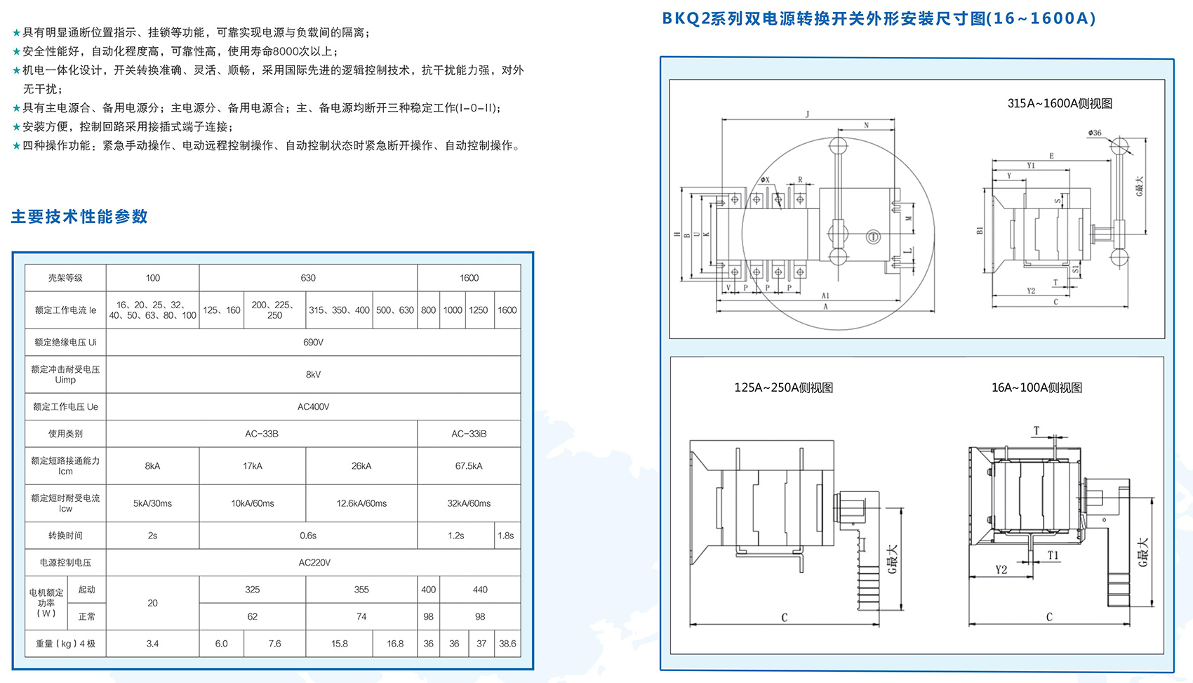 BKQ2系列双电源自动转换开关电器主要用于交流50Hz,额定工作电压400V及以下,额定工作电流16A至1600A的配电或电动机网络中一主一备或互为备用电源转换系统及市电和发电机组的负荷转换。同时可用于不频繁接通与分断电路及线路的隔离之用。产品广泛应用于消防、医院、银行、高层建筑等不允许断电的重要供电场所的输、配电系统及自动化系统。本产品符合GB/T 14048.11《低压开关设备和控制设备 第 6-1 部分:多功能电器 转换开关电器》。